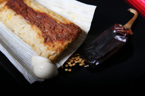 - Made with our homemade white field corn masa filled with beef and our red chile sauce.